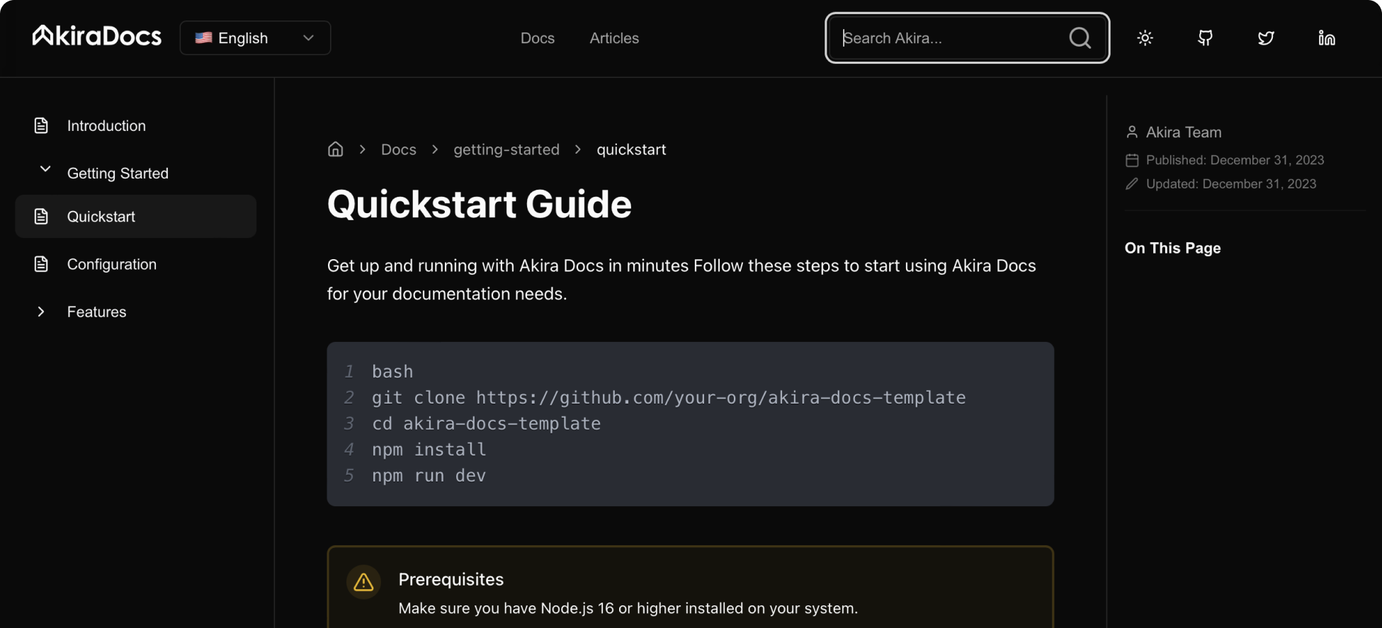AkiraDocs enables you to effortlessly create, publish, and update technical documentation with AI, while providing your customers with an intuitive AI-powered navigation experience.